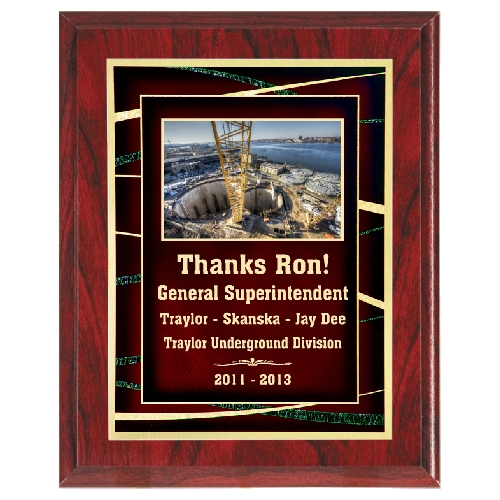 This is a totally different looking plaque; the board is red. Be the first to present this new generation of plaque designs. Your custom logo or picture can be added at no extra charge.